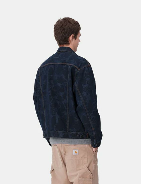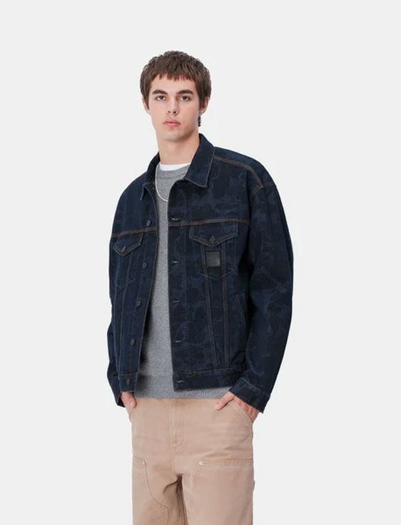 ダックヘルストンジャケットは、ヘビーウェイトのコットンデニムを使用した裏地なしのスタイルで、カモフラージュ柄の総柄が特徴。