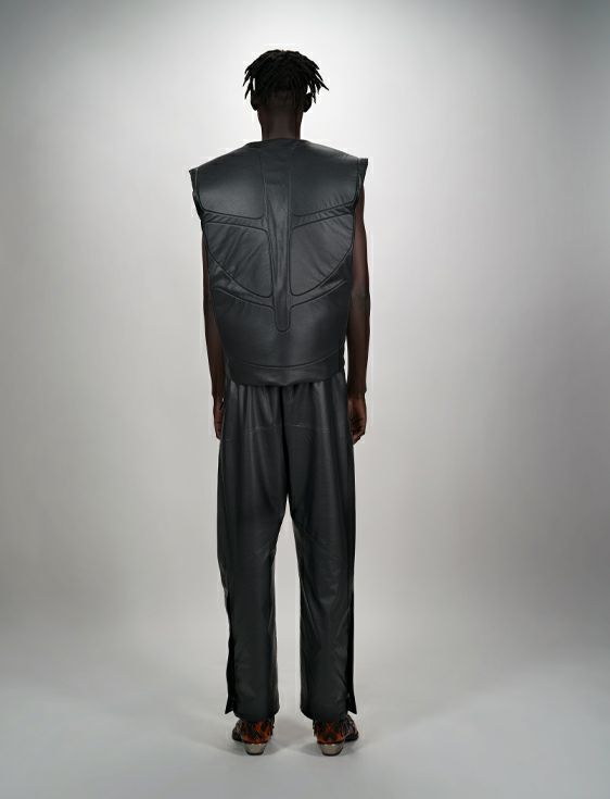 持続可能性を重視したこのパンツは、リサイクル ポリエステルで作られた裏地が特徴で、ファッション性と環境意識を組みあわせたテクスチャード加工のプレザー バイカー パンツとなっている。快適性と耐久性を優先しながらステートメントを実現。