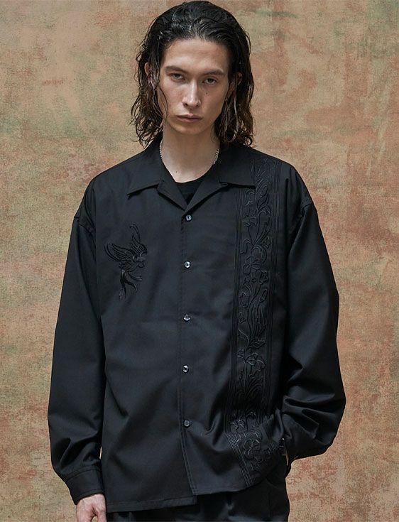 フロントには身頃と同色のオリジナルグラフィックのツバメとフラワーモチーフのハイクオリティの刺繍が入り、まさに大人のオープンカラーシャツ。